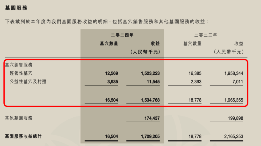 墓穴销售服务的收入也占了营业总收入的绝大比例,2024年墓穴销售收入为15.35亿,占当期收入的比例为74%。