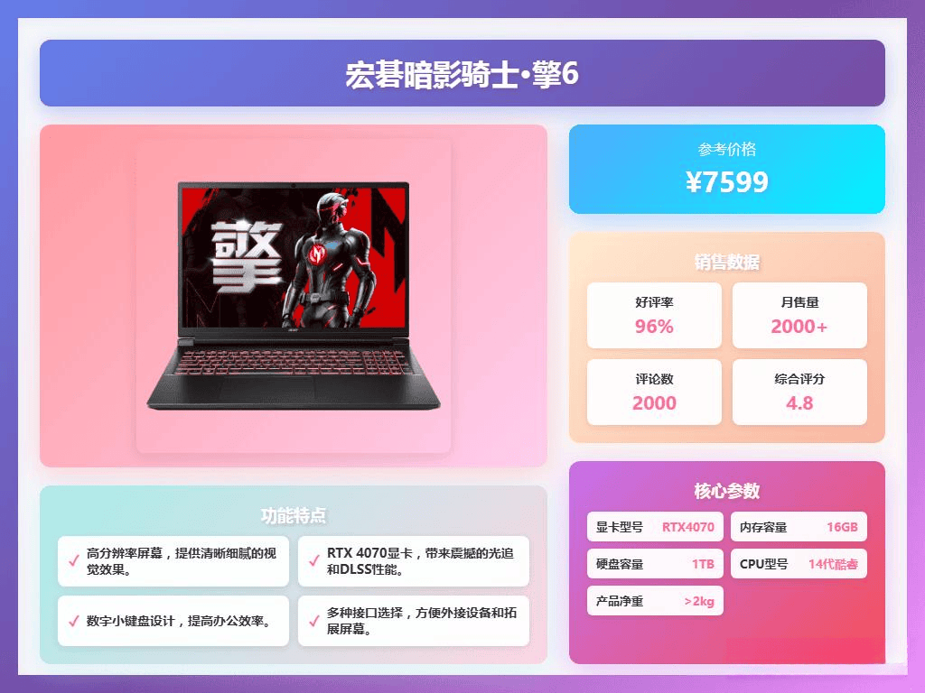配备NVIDIA GeForce RTX 4070显卡,支持DLSS 3.5,具备2倍光追性能和4倍性能提升,画面细节还原得很棒,玩游戏、做图都能应付得挺顺手。散热设计也很到位,长时间用也不会过热,体验还算不错。