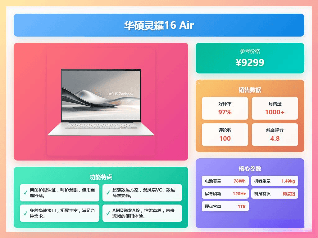 16英寸的屏幕,2.5K高分辨率,色彩非常丰富,画面很细腻,看视频、做设计都挺舒服的。120Hz高刷新率也让画面更流畅,无论是办公还是娱乐,视觉体验都还不错,工作中不会觉得刺眼。